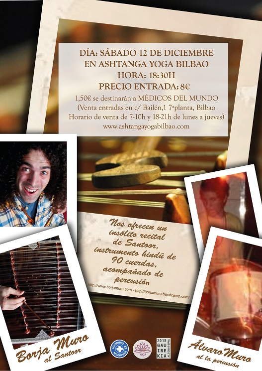 El intérprete será Borja Muro, músico y compositor bilbaíno ganador del concurso "Homenaje a Mikel Laboa" en el año 2010 y que además se cuenta entre uno de los escasos especialistas en santoor que hay en Occidente. Aquí puedes visitar su página web personal. Su santoor, de 90 cuerdas, percutidas con macillos de madera, inundarán Ashtanga Yoga Bilbao con los sonidos ancestrales de Oriente fusionados con la creatividad e influencias de un artista de Occidente. Álvaro Muro acompañará a su hermano a la batería. Aquí puedes escuchar varias canciones interpretadas por Borja Muro al santoor